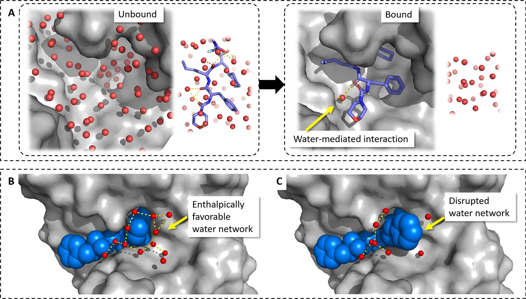 On the other hand, some water molecules may need to be displaced upon ligand binding. If a water molecule is energetically unfavorable or prevents optimal ligand contacts, it will likely be replaced by the ligand during the binding process. Including such water molecules in the docking procedure could hinder the identification of the correct ligand pose.